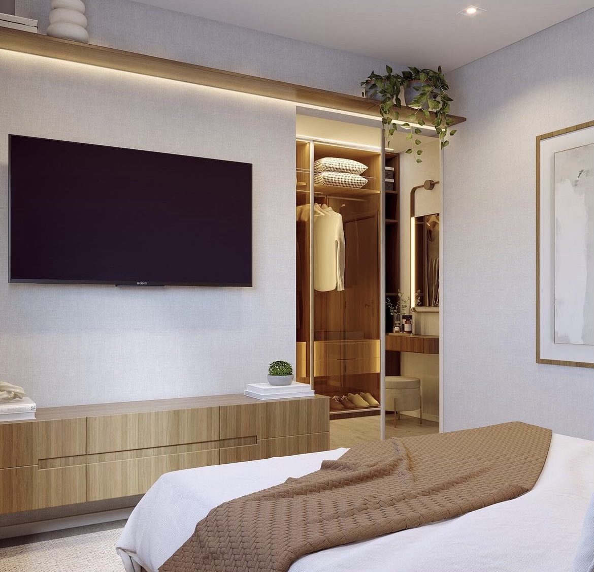 – Mur de télévision discret et fonctionnel : Un design épuré qui intègre les rangements et laisse l’espace fluide et ordonné.