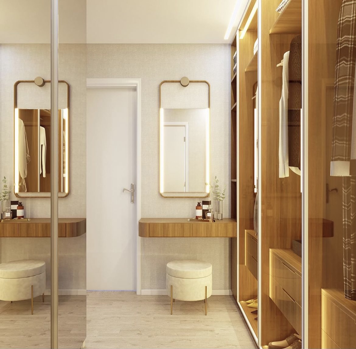 – Coiffeuse contemporaine : Un meuble élégant et minimaliste, parfait pour vos routines quotidiennes, agrémenté d’un miroir rétroéclairé qui illumine la pièce avec subtilité.